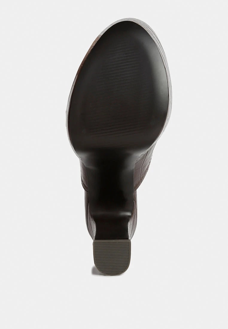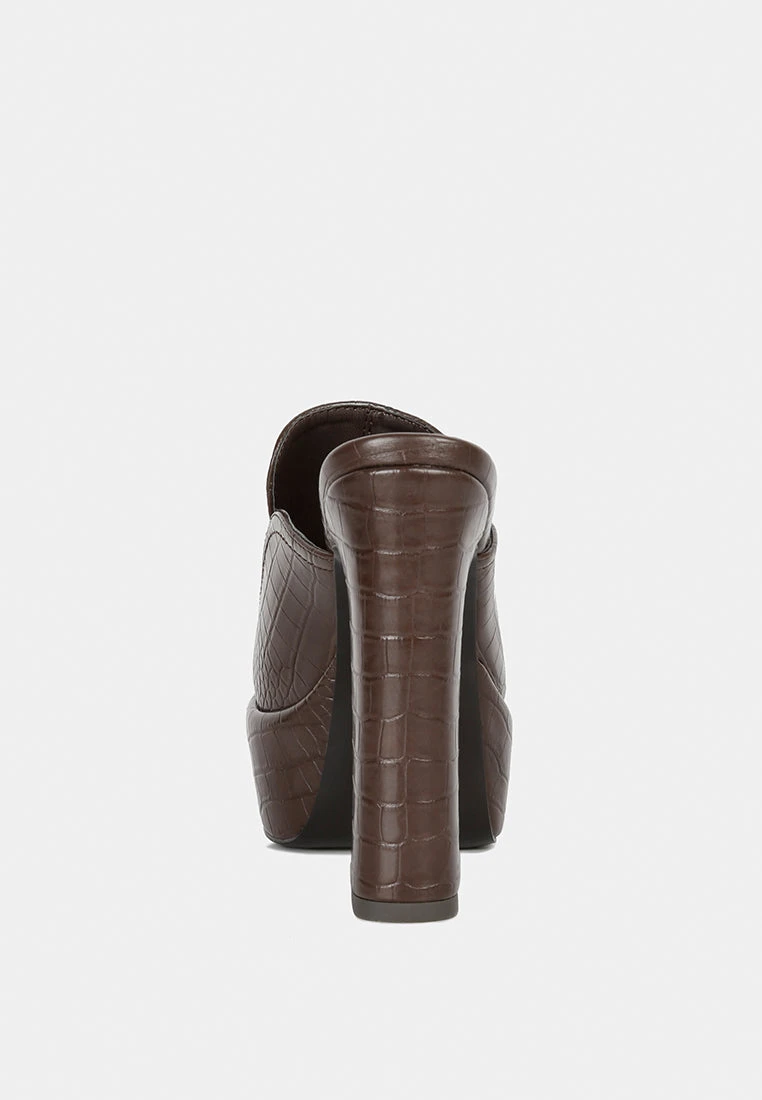 Beautifuly Handcrafted, the contemporary take on mules is droolworthy! The croc textured leatherette crafted on raised platform with high block heels is a head turner. It has lightly padded insole which cuts strain!