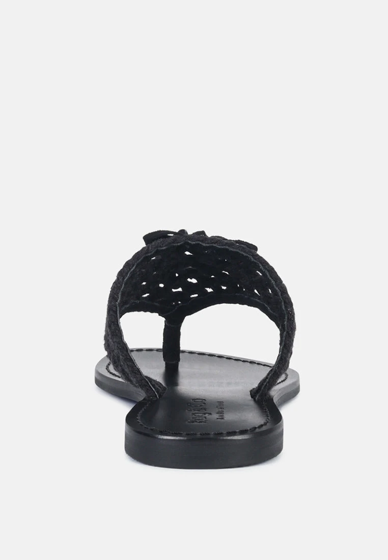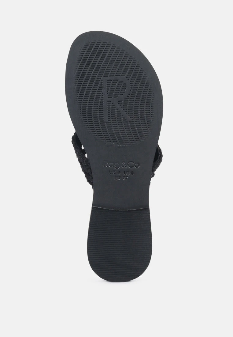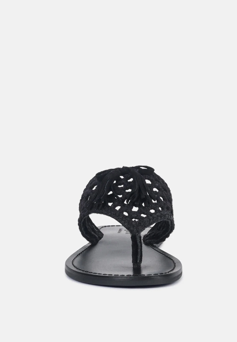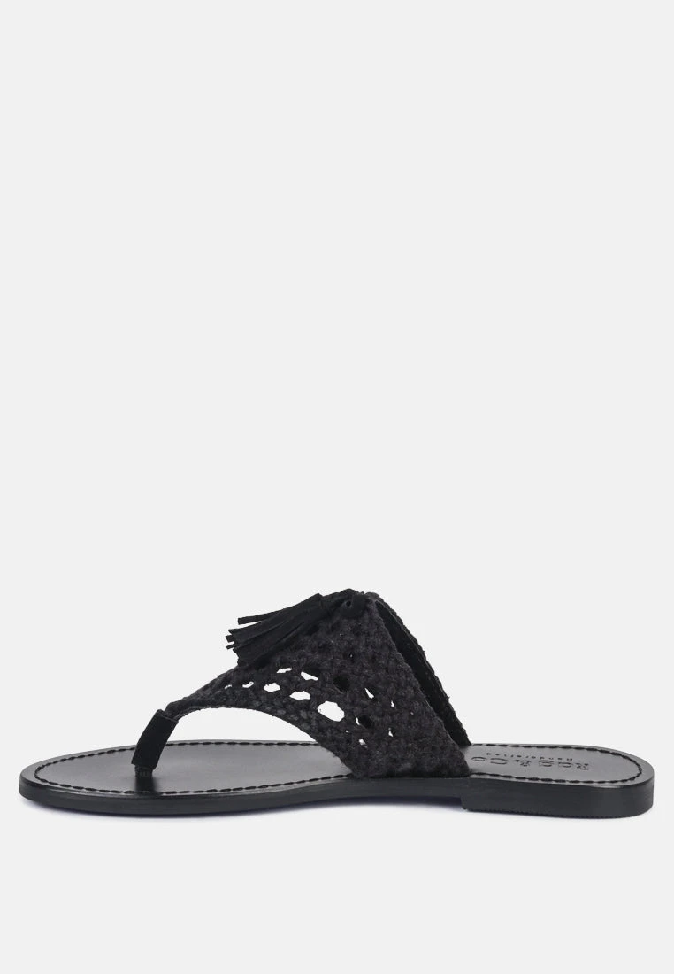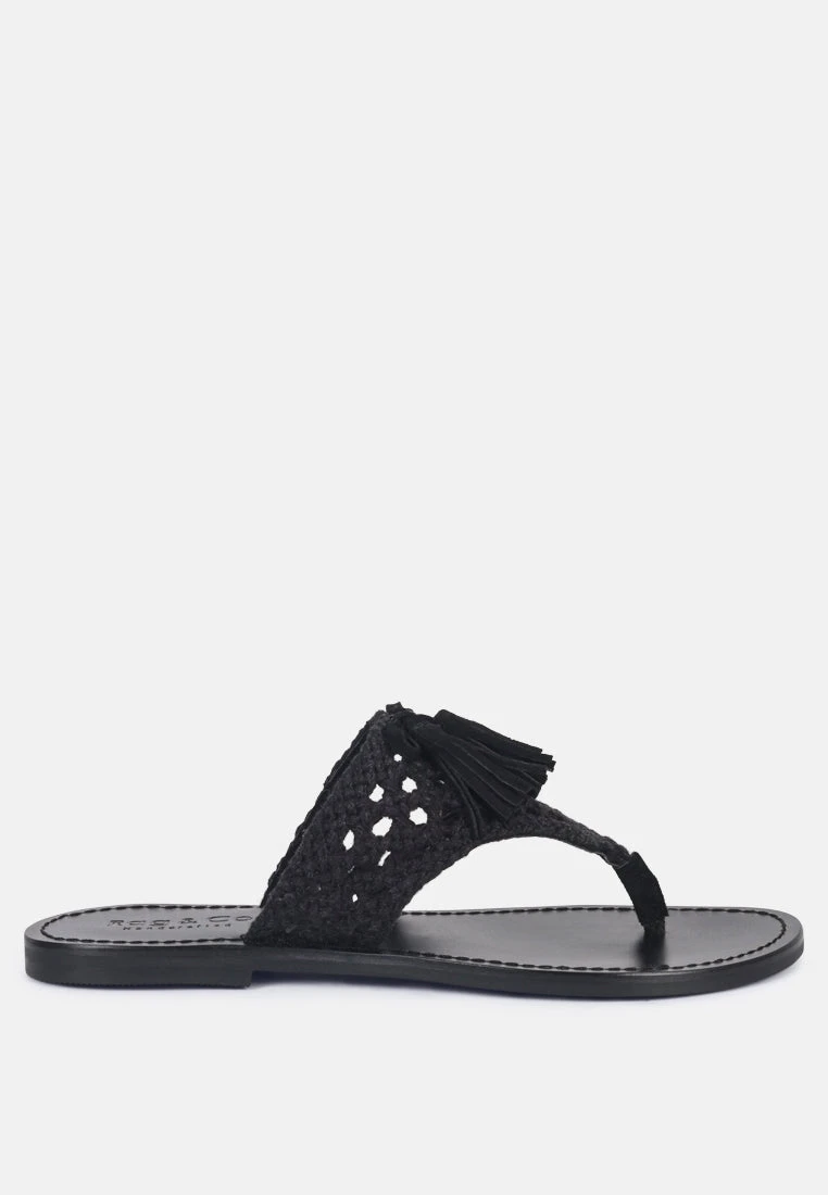 The Classic summer Thong flats with 100% Natural cotton woven structure with soft suede frame detail and the tassels at the top. The round toe open slides are casual, comfort shoes from Rag & Co.