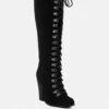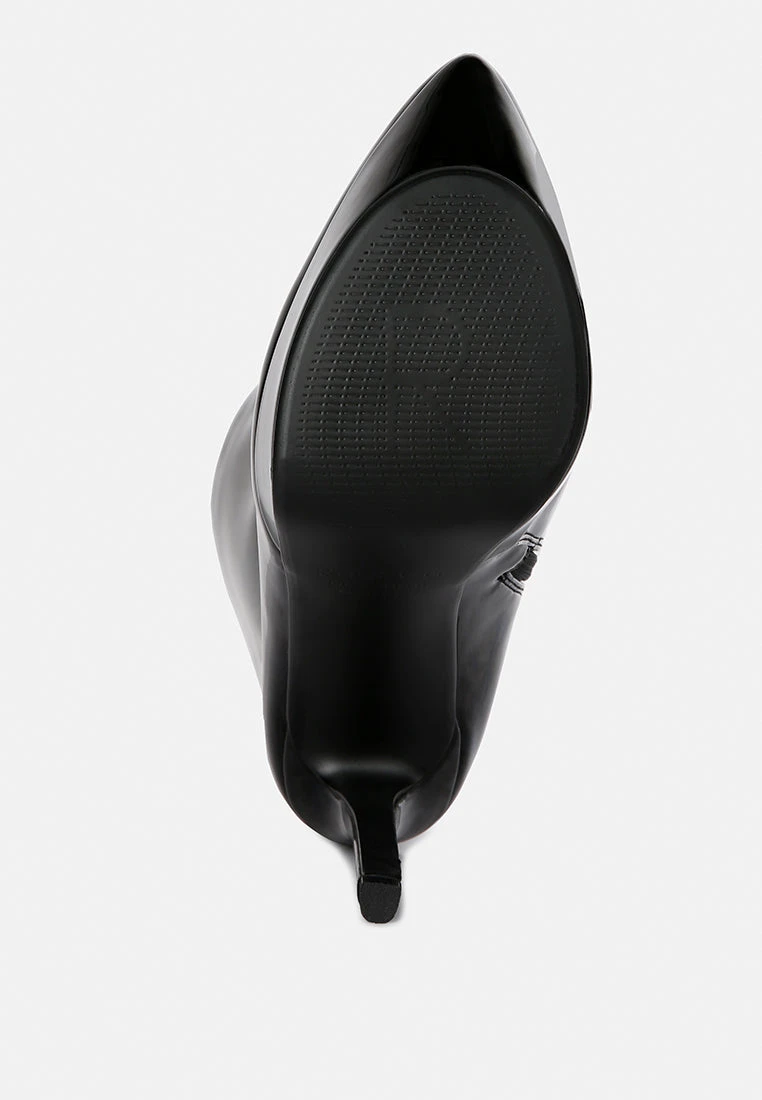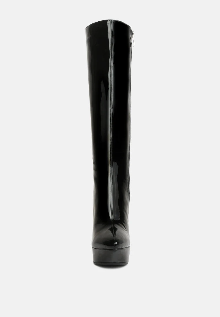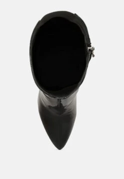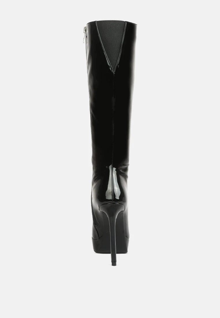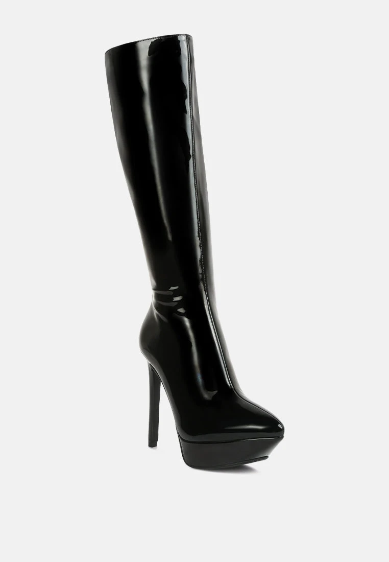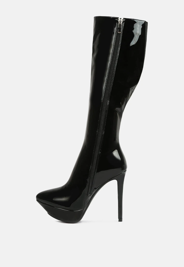 For the winter stunner, this high heeled patent long boot will grab all looks! The high platform elevates the height further, the pointed heels make it sharp. Comes with long side zipper which makes it easy to wear. The calf high heeled boots have elasticated gussets which add to flexibility and fit.