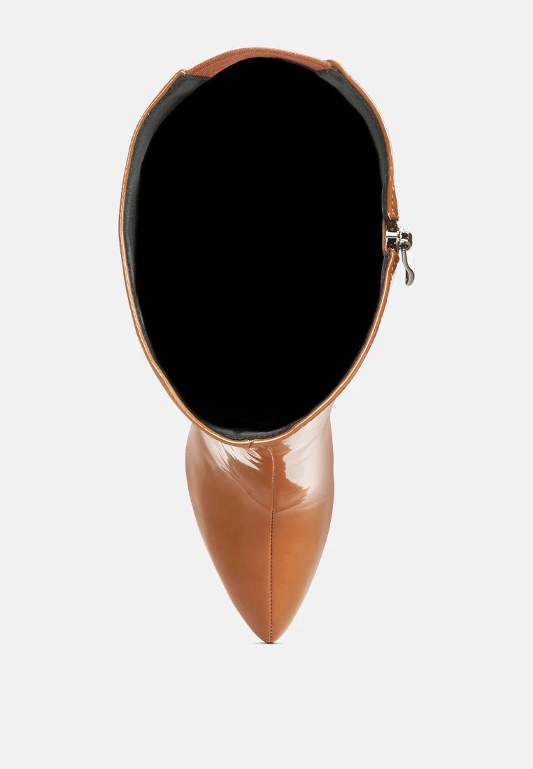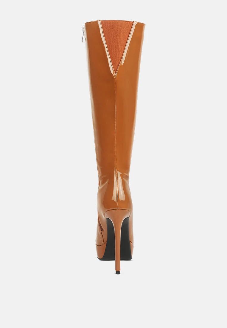 For the winter stunner, this high heeled patent long boot will grab all looks! The high platform elevates the height further, the pointed heels make it sharp. Comes with long side zipper which makes it easy to wear. The calf high heeled boots have elasticated gussets which add to flexibility and fit.