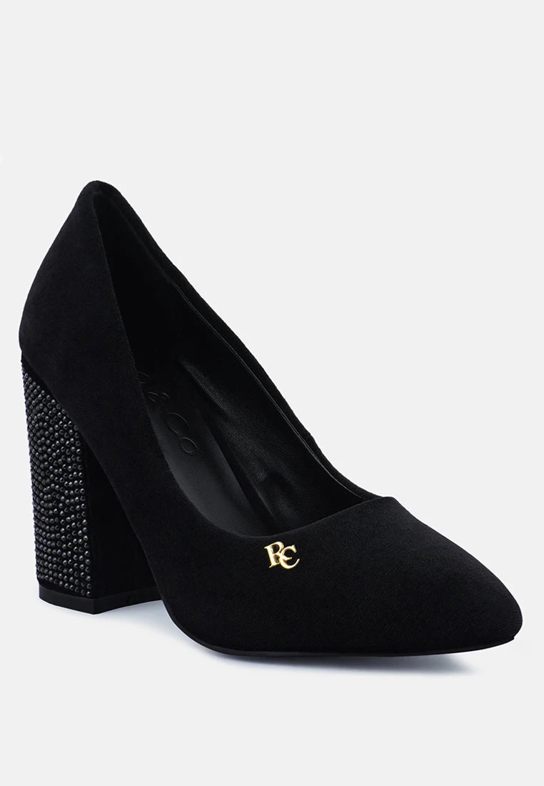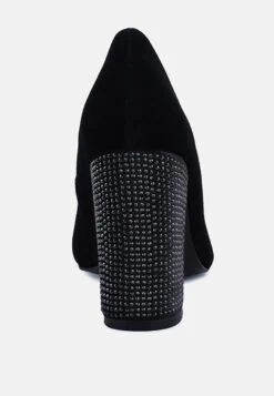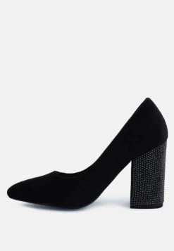 The rhinestone emebellished block heel is the accentuating element of the pumps and elevate the whole look of the footwear. The pair is versatile yet elegant and lively with the glinting embellishments. The velvet exterior looks rich and the soft innersole offers a comfortable wear. These are perfect for occasions such as weddings and black tie-events where you want to be effortlessly stylish.