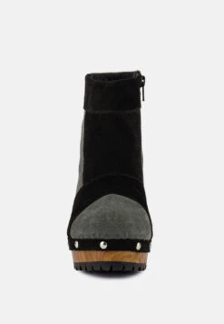 Handcrafted wood clog boots with stacked wooden block heels; this pair of meticulously crafted transition season boot made with patchwork suede is work of art with purpose! Has beautifully lined metallic studs which add to its long life and look. The lining is constructed in black organic cotton fabric which breathes! The super comfortable and handsome boots are timeless addition to your shoedrobe. Comes with side zipper opening making it easy to wear.