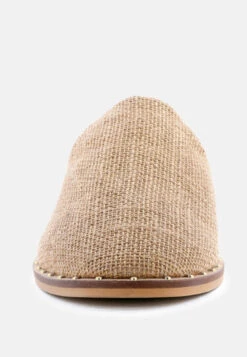 Decorated with tiny studs along with the insole frame, this canvas mules in camel with glitter yarns woven in between is a certain aesthetic you would definitely love! Sets well on the feet, and is for all-day wear.