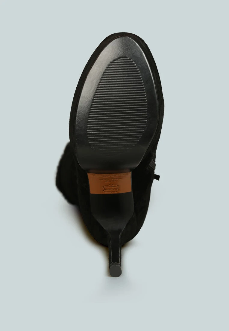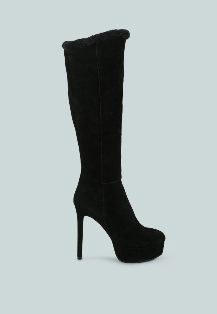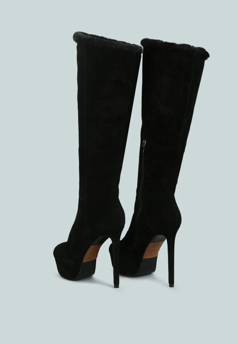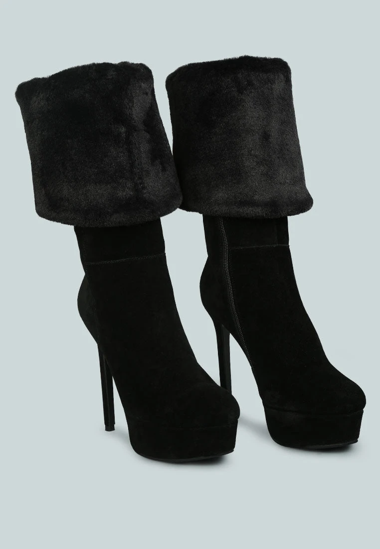 The boots can be worn as Knee Boots with a warm feel, also it can be folded and worn as a Calf boot for ultimate elegance. They exhibit a sense of opulence with the gorgeous shear-ling detail that looks Luxe. The high platforms are nothing short of stylish extravaganza and would look stunning paired with a fur coat for a dramatic yet chic outfit. The zipper opening makes them easy to wear while the lightly padded insoles cut strain.