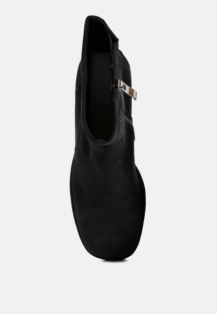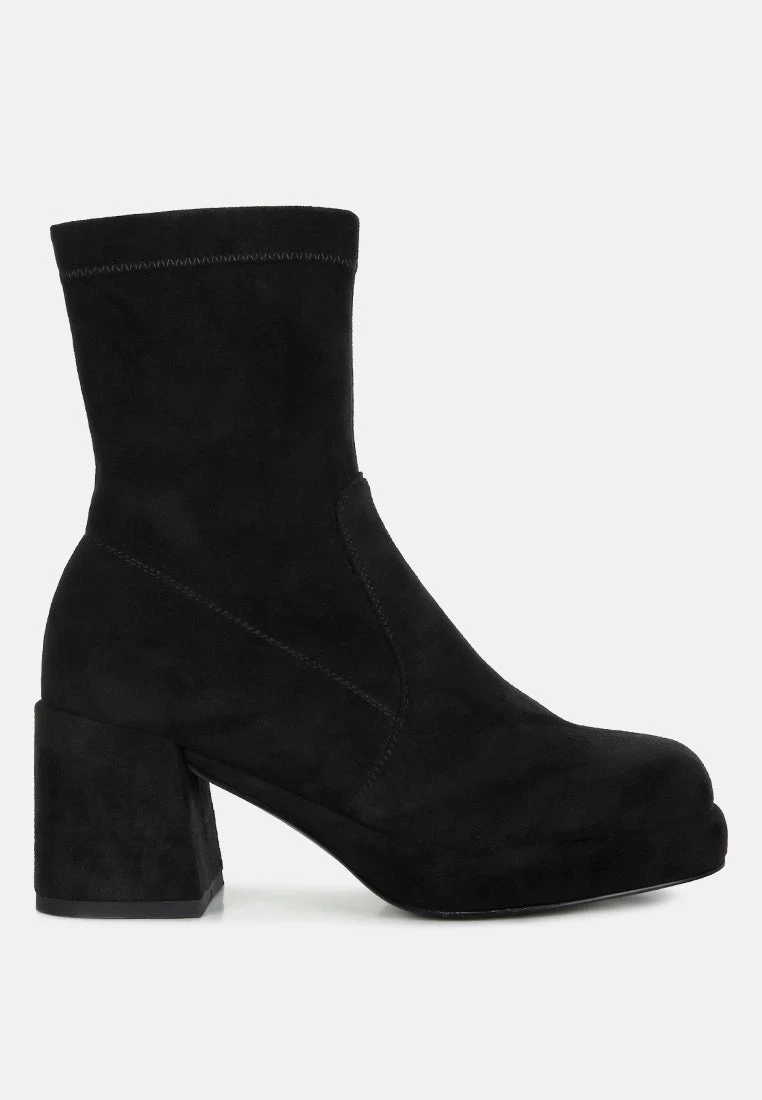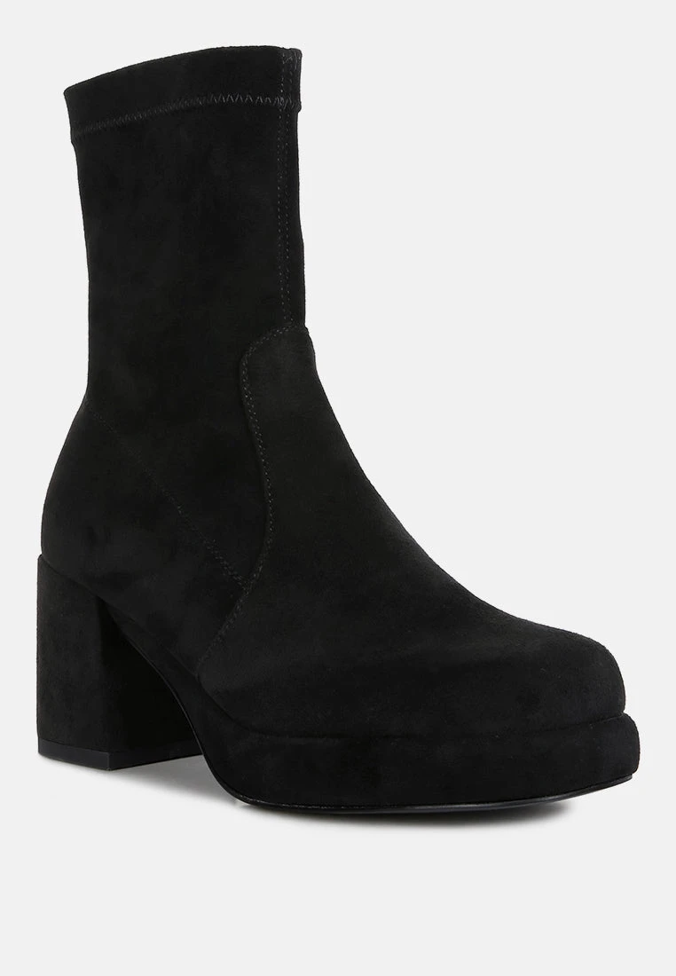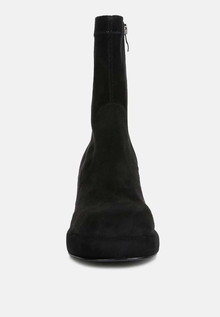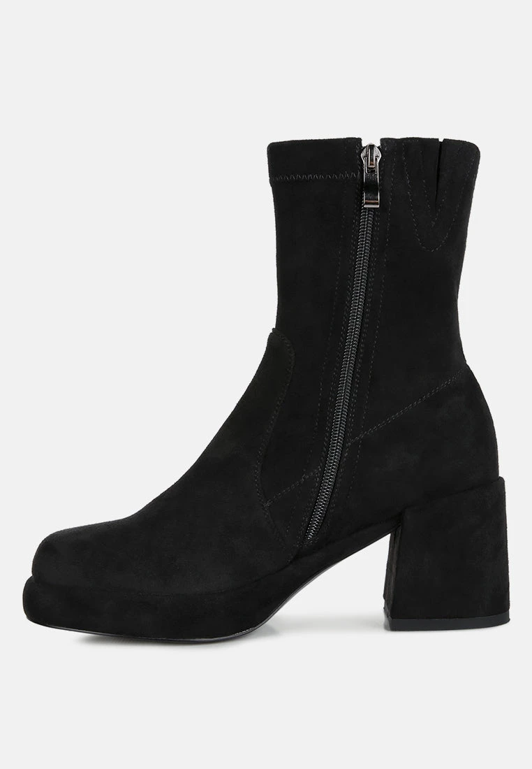 Mid High block heeled comfortable and plush ankle boot, crafted in stretchable fine suede is class apart. Comes in trendy square cut toe and block heels, this pair is easy to wear with a side zipper opening.