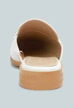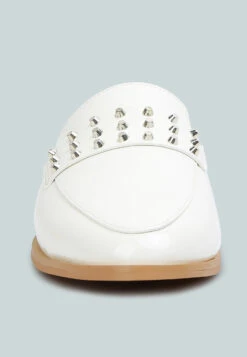 Flat casual mules for women; it has lighlty padded insole which gives ample support. The metal studded detail adds detail to the shiny patent almond toe flats. The low heel is a comfortable semi casual style for all day wear.