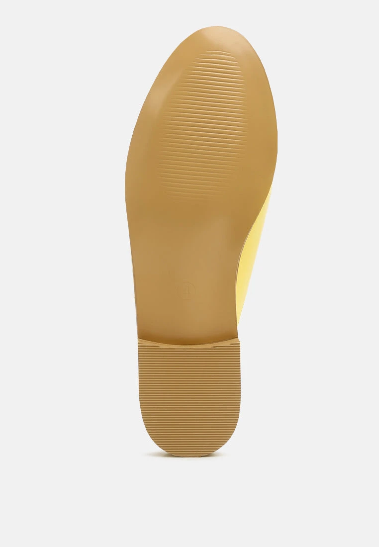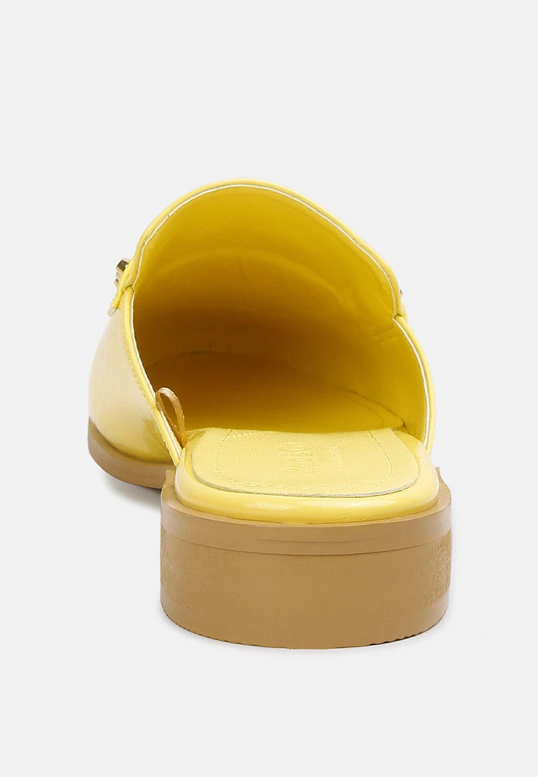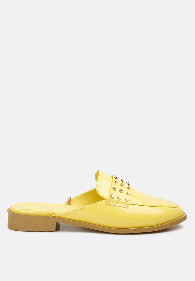 Flat casual mules for women; it has lighlty padded insole which gives ample support. The metal studded detail adds detail to the shiny patent almond toe flats. The low heel is a comfortable semi casual style for all day wear.