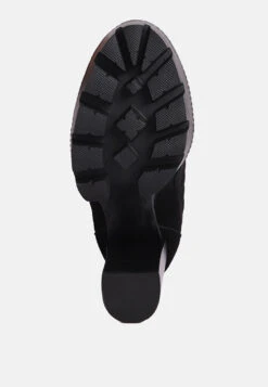 Stack Block Heel pattern on quilted suede is quite an aesthetic! Comes with micro suede panel which has metallic eyelets . The lace up ankle boot has chunky lug sole and offers support across surfaces.